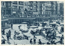 Strandrecreatie op het groot strand, de nieuwe badinstallaties en de villa's langs de Albert I-Promenade.