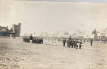 Vanaf augustus 1913 werd voor het eerst een militaire oefening gehouden. Links, detail van de duivenschieting