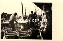 FormaatΒ : 9 x 14 cm. - Sorteren van de vis. De vislossersΒ halenΒ de vissenΒ van tussenΒ hetΒ ijsΒ en klasseren ze per soort en grootteΒ in vismijnbennen. Rechts, Walter Debrock.Β