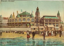 Strandrecreatie op het groot dtrand tijdens de Belle Epoque. De traditionele badkarren ontbreken niet. Op de achtergrond, detail van de west- en noordgevel van het derde Kursaal langs de Zeedijk