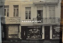 Tabakswinkel in de Adolf Buylstraat nr. 42 van Edouard Simon, circa 1902-1906. Links Imprimerie Economiqe Et. Van de Water. Rechts A l’Incroyable bij Bossuyt-Benoit