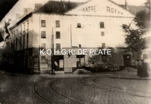 Formaat : 10 x 15 cm. - Théâtre Royal aan het komedieplein (nu Marie-Joseplein) met links de Weststraat (nu Adolf Buylstraat). Tramsporen op de voorgrond