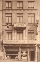 A. Montgomerency 3328. Ostende - (Près Digue). 39, Rampe de Flandre. Restaurant La Marée & Hotel Great Britain. Vue sur la Mer - Tout confort. Dîners à prix fixe et à la carte. Cuisine soignée faite par le Patron. Spécialité de Poisson, Huîtres & Homards. Ouvert toute l'année - Pension complète. A. Paternoster. Luifelopschrift : Dortmunder Union Bier. Gevelopschrift links onder : Furst Pilsner