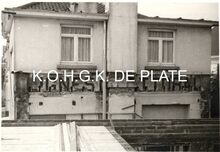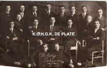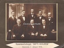 Formaat : 8,5 x 13,5 cm. - Bijeenkomst van Atheneumstudenten tijdens de Eerste Wereldoorlog. Hun lokaal was estaminet "In de Wederkomst", gelegen op de hoek van de Alfons Pieterslaan en de Sint-Peterburgstraat, nu Leon Spilliaertstraat.