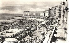 Veel mensen genieten van het mooie weer op het groot strand in het interbellum. De westgevel van het derde Kursaal