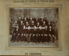 14 heren,poserend in de puinenvan de afgebrande Sint Pieters-