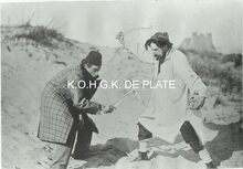 Formaat : 22 x 31cm. - Gevechtsscene met skeletdelen tussen James Ensor met boezemvriend Ernest Rousseau in de duinen