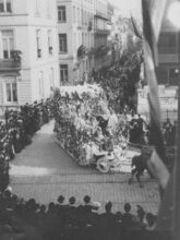 7 foto's : (1) Ligue des cochers (Oostende) : Les armées des différents pays de l'Europe, les Polanais, in de Kapellestraat nabij Hôtel de Bavière ; (2 en 3) Praalwagen van het inrichtend comité : Le Reine des Plages ; (4) De Oude Wasschers met praalwagen en groep : L'union des Pêcheurs ; (5 en 6) Nu voor Later (Oostende) met vier praalwagens : (5) de Lente en (6) de Winter, op de hoek van de Louisastraat en de Van Iseghemlaan en (7) Praalwagen van La Wallonie : Char de la Wallonie. - De foto's staan in de volgorde zoals de stoet uitging. - Map 006 C-15a-g
