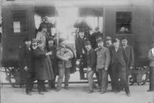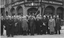 Formaat : 19 x 29 cm. - Foto genomen ter gelegenheid van de diamanten bruiloft van het echtpaar Verstraete- Quick. Zittend, derde van links, Jos. Lekens (°1883), van wijn- en likeurhandel "Au Vigneron", naast hem rechts, Al. De Graeve, van "Au Drapeau Belge", dan L. Hendrickx, flessenhandel, Fr. Verbiest, confiserie. Rechtstaand, derde van rechts, A. Vandewyngaerde, transport - Map 006 A-128