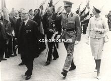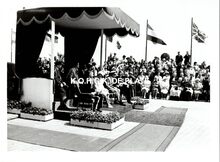 Formaat : 11 x 14,5 cm. - De eretribune op het Zeeheldenplein. Van links naar rechts, de provinciegouverneur van West-Vlaanderen Pierre van Outryve d'Ydewalle, Koningin Fabiola, Koning Boudewijn en burgemeester Jan Piers.