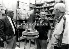 Formaat : 12,5 x 17,5 cm. - August Michiels aan het werk aan de beeldengroep in zijn atelier.