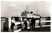 Van Mieghem A. Oostende, NΒ°96. - Oostende - Staketsel. Estacade. Palissade. Staket. - Het einde van het Westataketsel, of "'t koptje van 't hoofd". Je kon er een kruisnet huren en proberen een krabbetje of visje te vangen. Links, was het "cafΓ©paviljoen", waar je kon genieten van een drankje en de gezonde zeelucht. Achteren, het ijjzeren torentje met mistbel. Een pakketboot van de Oostende Dover lijn vaart de havengeul binnen.