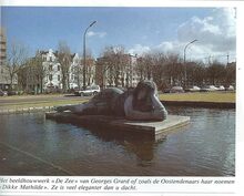Ed. L'Heembeekoise-Bruxelles, NΒ° 41. - Oostende Leopold Park. Bloemen Uurwerk. Ostende - Parc LΓ©opold. L'Horloge fleurie. - De sculptuur "De Zee", genoemd "Dikke Mathille" van beeldhouwer George Grard, langs de Leopold II-laan. Op de achtergrond, het bloemenuurwerk in het Leopoldpark.