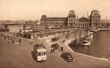 Ed. Bazar d'Ostende, 72 Rampe de Flandre, NΒ°20. - Ostende - Gare Maritime. Zeestation. - Mooi zicht van het Zeestation en zijn omgeving. Vooraan, de Vindictivelaan en een stadstram nabij het wachthuisje "Oostende-Kaai". Er achter, het gebouw voor de sluiswachters en de Visserskreek. Rechts, het eerste handelsdok en de brug over de zeesluis die de verbinding vormt tussen de handelsdokken en de haven.