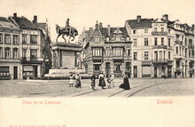 Multikaart. Inzet : Schepen Daniels Gerard op het balkon van het stadhuis langs de Leopold II-laan met zicht op het schoolschip-museum "Mercator" ; Het stadhuis langs de Leopold II-laan en het Vuurkruisenplein met het beeld "De Wind" van Emile Bulcke ; Het bloemenuurwerk in het Leopoldpark