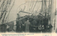 L. Lagaert, B.-N.. - Le Ministre Francotte adresse son allocution aux cadets du dernier dΓ©part, sur le pont du de Smet de Nayer. - Gustave Francotte (1852-1925), minister van Handel en Nijverheid, houdt een toespraak voor de leerlingen van het schoolschip "Comte de Smet de Naeyer". Het zeilschip vertrok op 11 april 1906 uit Antwerpen en verging op 19 april 1906 in de Golf van Biskaje.