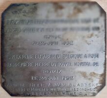 Op de keerzijde : horizontaal H.M. KONINGING ELISABETH VAN BELGIE LEGT DE / EERSTE STEEN VAN HET NIEUWE HOSPITAAL VAN / RONSE / OP 28 JUNI 1952 --------- S.M. LA REINE ELISABETH DE BELGIQUE A POSE / LA PREMIERE PIERRE DU NOUVEL HOPITAL DE / RENAIX / LE 28 JUIN 1952 / AAN DE HEER A. VAN GLABBEKE / GEWEZEN MINISTER VAN VOLKSGEZONDHEID / UIT ERKENTELIJKHEID