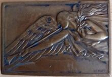 Op de voorzijde : het beeld van een engel met gespreide vleugels dat op een bazuin blaast met in de linkerhand een lauriertak, rechtsonder gesigneerd L. FRISCH