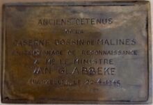 Op de keerzijde : horizontaal ANCIENS DETENUS / DE LA / CASERNE DOSSIN DE MALINES / EN TEMOIGNAGE DE RECONNAISSANCE / A MR LE MINISTRE / VAN GLABBEKE / BRUXELLES, LE 22-4-1945