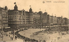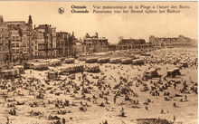 Nels, Ern. Thill, Bruxelles. - Ostende - Vue panoramique de la Plage Γ l'heure des Bains. Oostende - Panorama van het Strand tijdens het Baduur. - Strandrecreatie op het Groot Strand. De Zeedijk ten westen van de kursaal richting het "Royal Palace Hotel". In het midden het Koninklijk Chalet en het "Thermae Palace" in aanbouw