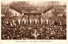 Reclamekaart van de Koloniale Loterij. Trekking van de Koloniale Loterij in de concertzaal van de derde kursaal in 1938