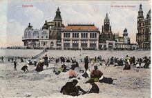 Wilhelm Hoffmann A.-G. Dresde, NΒ° 12482. - Ostende - La marΓ©e montante. - Het water "komt op", of het wordt vloed. Strandrecreatie op het Groot Strand. Kinderen pootjebaden langs de vloedlijn. Op de achtergrond, de westgevel van de derde kursaal langs de Zeedijk.