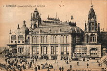 Nels, Bruxelles, SΓ©rie Ostende, NΒ° 64. - Ostende - la Gare. - Het tweede spoorwegstation van Oostende (Oostende-Stad) aan de Vandersweepplaats op de wijk Hazegras. Nu, het Ernest Feysplein. Links, de Kapellebrug over de handelsdokken. Merk op, de reclamezuil van de Stad Oostende.