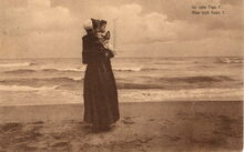 Nels. Ern. Thill, Bruxelles, sΓ©rie Plage, NΒ° 64. - Ou reste Papa ?. Waar blijft Vader ?. - Een vissersvrouw met kind op haar arm aan de vloedlijn.