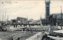 Albert, NΒ° 218. Phototypie A. Dohmen, Bruxelles. - Ostende - La Gare Maritime. Ostend - The Harbour-Station. - Vooraan, een gedeelte van het oorlogsmonument voor de gesneuvelde Oostendse burgers en soldaten van beide Wereldoorlogen. Een stadstram nabij het wachthuisje "Oostende-Kaai" langs de Vindicitivelaan. Er achter, het lokaal voor de sluiswachters. Links, een gedeelte van de Visserskreek. Rechts, het eerste handelsdok en de brug erover en links, de zeesluis die toegang gaf tot de haven.