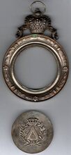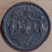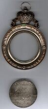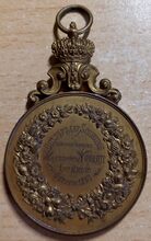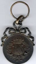 De prijspenning is rond met gladde geprofileerde rand, kroon met kruis op voluut en ring