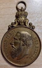 Op de voorzijde : Het borstbeeld van koning Leopold II in uniform met eretekens, rondom rechts 1830-1905, linksonder gesigneerd G. DEVREESE