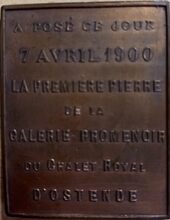 Op de keerzijde : horizontaal A POSE CE JOUR / 7 AVRIL 1900 / LA PREMIERE PIERRE / DE LA / GALERIE PROMENOIR / DU CHALET ROYAL / DβOSTENDE