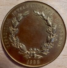 Op de keerzijde : Centraal twee eikentakken onderaan samengestrikt, langs de buitenrand rondom boven EXPOSITION INTERNATIONALE DβOSTENDE, rondom onder 1888