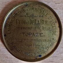 Op de keerzijde : rondom boven β LβADMINISTRATION COMMUNALE DβOSTENDE β , rondom onder 16 JUILLET 1897 β 8 AVRIL 1907, centraal horizontaal AU CAPITAINE / PEDRO DE LA RUE / COMMANDANT LE S/S BELGE / βTOPAZEβ / A LβOCCASION DE SON MILLIEME VOYAGE / SUR LE PORT DβOSTENDE