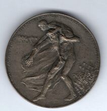 Op de keerzijde : rondom boven LA BONTE REIGNE DANS LES COEURS, centraal een geknielde vrouw geeft een baby aan een rechtstaande en gedrapeerde vrouw, op de achtergrond een stralende zon en de zee, onderaan 1910
