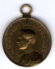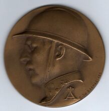 Op de voorzijde : Het borstbeeld van koning Albert I in gevechtstenue met helm, rechtsonder een gekroond initiaal A, signatuur E. De Bremaecker