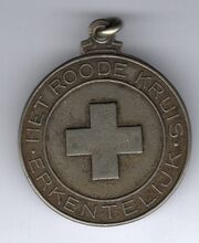 Op de keerzijde : tussen twee geprofileerde randen rondom HET ROODE KRUIS . ERKENTELIJK, centraal een kruis