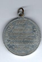 Op de keerzijde : rondom boven LβUNION FAIT LA FORCE, horizontaal -- / FORSAN VICTI / SERVI NUNQUAM / -- / PEUT-ETRE VAINCUS / ESCLAVES JAMAIS/ 1914-1916, rondom onder PLOUVIER-EDIT.HAVRE