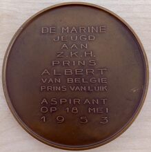 Op de keerzijde : horizontaal DE MARINE / JEUGD / Z.K.H. / PRINS / ALBERT / VAN BELGIE / PRINS VAN LUIK / ASPIRANT / OP 18 MEI / 1953, onderaan gesigneerd R. CLIQUET