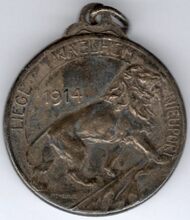 Op de keerzijde : een vrouw gezeten op een steen onder een boom, op de steen staat AOUT / 1914, de vrouw reikt het erelegioen uit, rechtsonder het gekroonde wapenschild van de stad Luik met stralen omgeven met de letters LG, rechts rondom GLOIRE ET HONNEUR, linksonder gesigneerd J. FISCH
