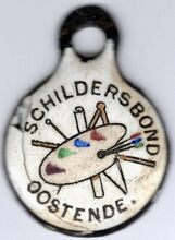 Op de voorzijde : rondom boven SCHILDERSBOND, rondom onder OOSTENDE, centraal een schilderspalet geplaatst op allerlei tekengerief