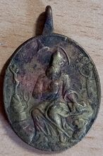 Op de keerzijde : rondom NOTRE DAME DE TONGRES PRIER POUR NOUS, centraal het beeld van de maagd Marie met Jezus op de arm, beiden met kroon