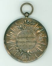 Op de keerzijde : centraal verticaal een lauriertak, rondom zonnestralen daar op centraal in een medaillon horizontaal A / LβHARMONIE COMMUNCAL / EUTERPE DβOSTENDE / 15 JUIN 1897