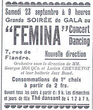 Advertentie : Grande soirΓ©e de gala au "Femina Dancing. Vlaanderenstraat 7, Oostende. 23/09/1922
