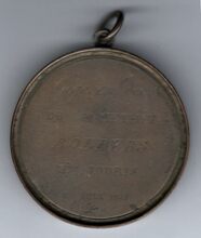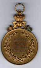 De prijspenning is rond met gladde geprofileerde rand, oog en ring, en is als volgt ingegraveerd