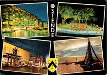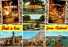 Cromo, KrΓΌger, NΒ° 933/120. - Inzet : "Montmartre" in de Langestraat ; Het Leopold II monument ; Het bloemenuurwerk ; Het beeldhouwwerk "De Zee", of "Dikke Mathille" van George Grard ; De Albert I-promenade ; De Kapellestraat bij nacht ; Een pakketboot van de Oostende Dover lijn in de havengeul
