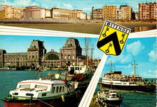 KrΓΌger, NΒ° 933/46. - Groeten uit Oostende. Un bonjour d'Ostende. Greetings from Ostende. GrΓΌsse aus Ostende. - Inzet : De west- en noordgevel van de vierde Kursaal en de appartementen langs de Albert I-promenade gezien vanaf het Groot Strand ; Het eerste handelsdok en het Zeestation ; Een pakketboot van de Oostende Dover lijn vaart de havengeul van Oostende in. Aangemeerd aan het Weststaketsel een pleziervaartuig van de rederij Franlis.