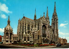 KrΓΌger, NΒ° 933/21. - De kerk gezien vanaf de hoek van de Jozef II-straat en de Sint-Pietersstraat. Links, de Koninginnekapel met het praalgraf van onze eerste koningin