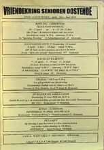 Vriendenkring Senioren Oostende. Onze activiteiten : april, mei, juni 2010. Bowling Competitie. Telkens op dinsdag. 20, 27 april en 4, 11, 18, 25 mei. Op 25 mei : Kampioenviering met receptie. Inschrijven vanaf 14.30 u. Aanvang 15.00 u. In "Sporting Bowling" St Sebastiaanstraat 26, Oostende. Dansnamiddagen : 2e donderdag van de maand. 8 april, 6 mei, 10 juni vanaf 15.00 u. Op 10 juni : Dansnamiddag met koud buffet. Zaal "Ten Stuyver" Stuiverstraat 357, Oostende. Manillen kaarting. 7, 21 april, 5, 19 mei, 2, 16 juni. 16 juni : Kampioenenhulde met receptie. Inschrijven vanaf 14.00 u. Aanvang : 14.30 u. stipt!. Vrijdag 7 mei om 9.30 u. Ter gelegenheid van Moederdag : Gezamenlijk ontbijt voor de oma's en de opa's. Taverne de Drie Sleutels, Jozef II straat 46, Oostende. Op bezoek bij James Ensor. Donderdag 24 juni 2010 om 14.15 u. Geleid bezoek t.g;v. de tentoonstelling gewijd aan deze beroemde Oostendenaar. Mu-Zee : Romestraat 11, Oostende. Bingo namiddag. Donderdag 29 april 2010 om 14.30 u. Restaurant Tearoom Benny's Vlaanderenstraat 13, Oostende. Petanque. Op dinsdag 1 juni hervatten we deze zomeractiviteit (en verder iedere dinsdag va. 14.30 u.) Oswherlu Lijsterbeslaan, Oostende Formaat : 42 x 30 cm