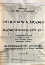 Petrus- en Paulusconcerten Oostende. Oostende Sint-Petrus- en Pauluskerk. Requiem W.A. Mozart. Zaterdag 13 november 2010, 20 u. Sarah Peire (sopraan), Anita Dur (alt), Ivan Gossens (tenor), Kris Belligh (bariton). Iepers Kamerkoor o.l.v. Dirk Coutigny. Orlandusensemble o.l.v. Peter Ledaine. Toegang : 10 EUR Formaat : 42 x 30 cm